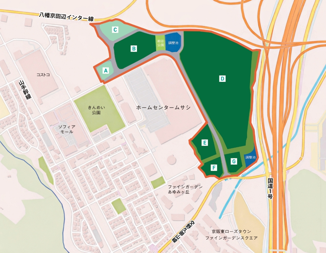 本事業は、京都府の八幡市・京田辺市の2市にまたがり実施された、全国的にも例の少ない組合施行による土地区画整理事業で、当社は、区画整理組合の業務代行者として、また一地権者として関与しました。