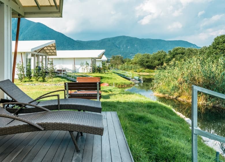 半世紀手つかずの圧倒的な自然の中に、水回り設備を完備した多彩な宿泊棟を場内に配置。
