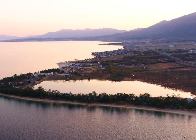 琵琶湖の至近、背後に比良山系の山裾が迫る圧巻のロケーション。